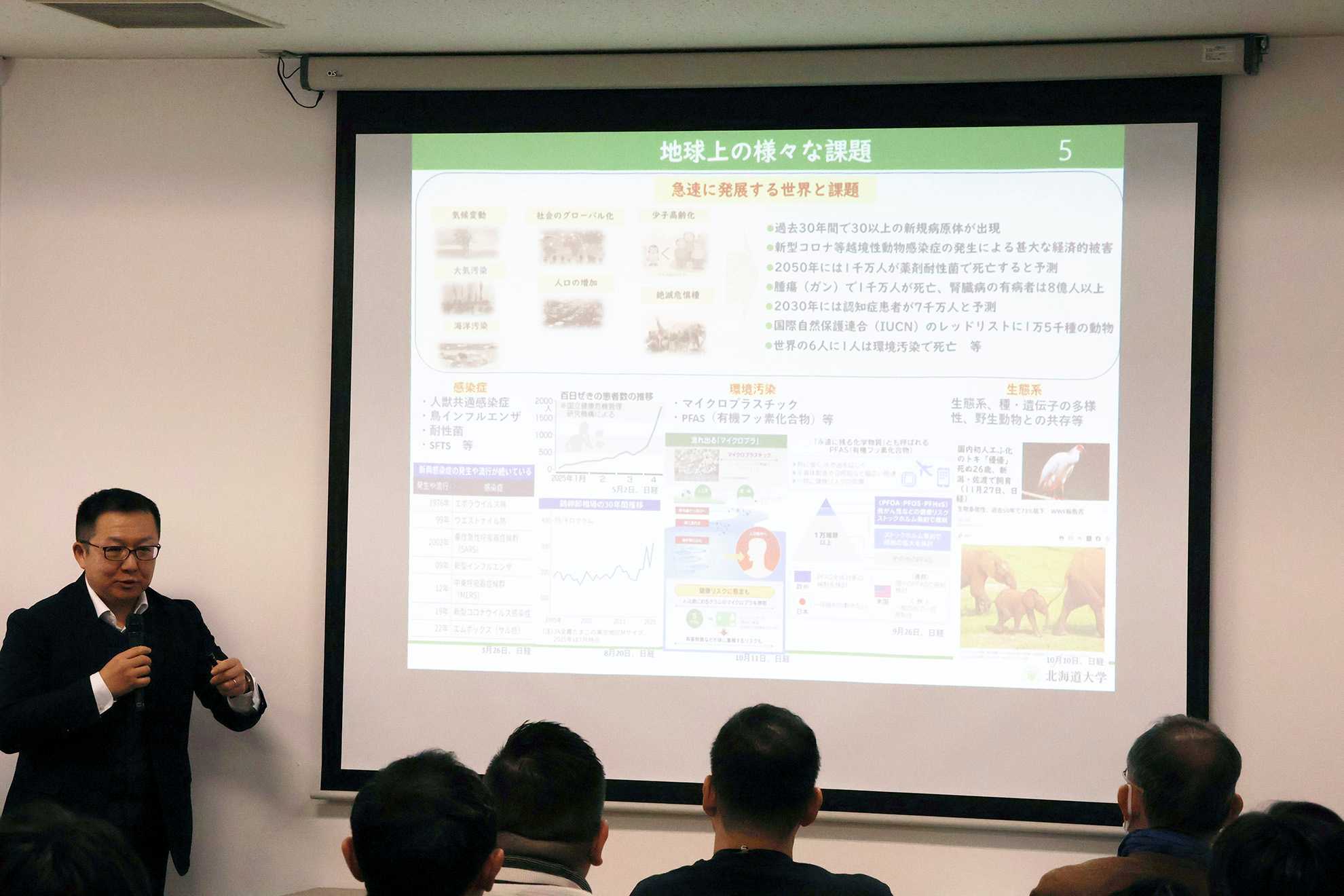 12月5日、道外経営者による北海道大学ツアー(同大学産学・地域協働推進機構 スタートアップ創出本部 戦略企画部門主催)において、社会連携部門の菊池栄作特任准教授が、様々な分野の道外経営者約40名に以下の点について説明を行いました。